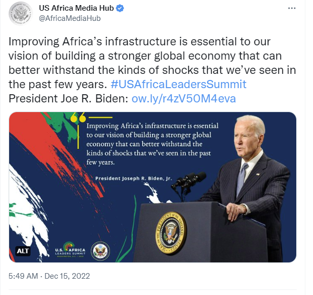Improving Africa’s infrastructure is essential to our vision of building a stronger global economy that can better withstand the kinds of shocks that we’ve seen in the past few years. #USAfricaLeadersSummit President Joe R. Biden: https://t.co/x9jXX4TWes pic.twitter.com/oZO0ELwnbl