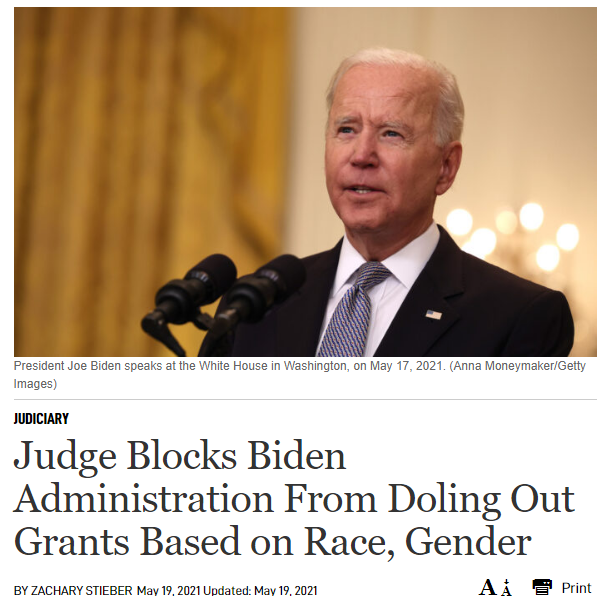 https://www.theepochtimes.com/mkt_breakingnews/judge-blocks-biden-administration-from-doling-out-grants-based-on-race-gender_3822305.html?utm_source=News&utm_medium=email&utm_campaign=breaking-2021-05-19-2&mktids=6f88c1b5feb8c798f210e9b725f2b871&est=k2RZko74TxD5rNoaFbxhK2rU4iMwl3AkHbiomtkIwekgPFWvTnbt6wbAU5eeJ5a9eb4%3D previous post Justice Dept Trying to Block Election Audit – If Nothing Is Wrong, Why Worry? next post Biden’s Winning at …..Inflation…. Related Posts Democrats Vote to Keep Funding Illegals, Even If... March 24, 2024 Biden gives $8B to Green Climate Fund December 9, 2023 Maybe VP Biden Didn’t Read or Know anything... October 11, 2023 Biden Averages Over 40% of His Time On... October 5, 2023 Democratic States that Support Abortion Up To Actual... October 5, 2023 Biden’s Booze Czar Says USDA May Soon Revise... October 5, 2023