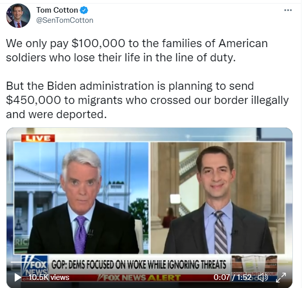 But the Biden administration is planning to send $450,000 to migrants who crossed our border illegally and were deported. pic.twitter.com/t09G52hNcm